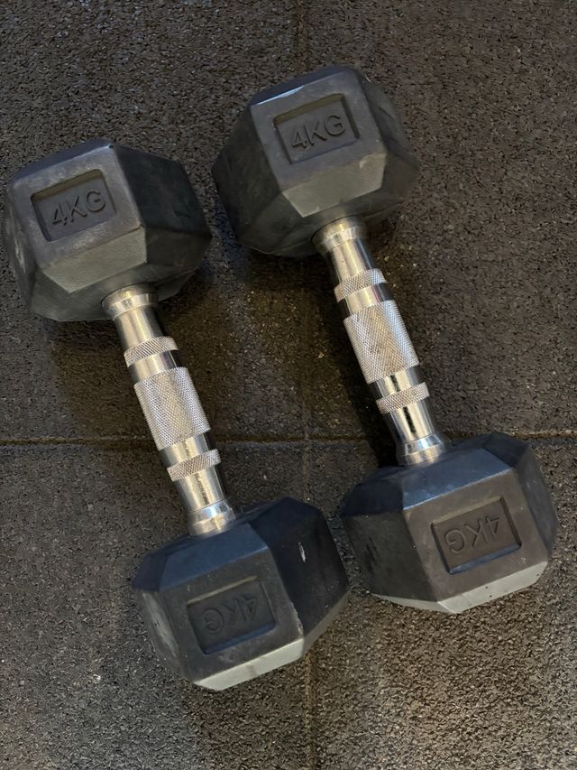 Detalles del productoPar de mancuernas hexagonales de 4 kg cada una.