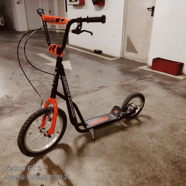 Detalles del productoSuper patinete de 2 ruedas hinchables (delantera 16' y trasera 12'), frenos vbrake, caballete; para niños de 5 años en adelante hasta un máximo de 100kg; diseño exclusivo; llantas de aluminio y suelo antideslizante; cuadro aerodinamico; manillar con protecciones. Esta nuevo .
