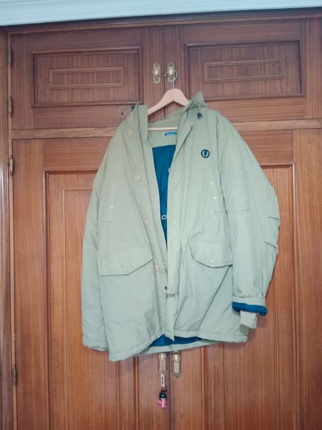Parka Fred Perry talla L. Producto original. De color beige con bordado en la manga derecha. Botones originales menos la cremallera. Tiene capucha. Dos bolsillos grandes en parte delantera y dos a la altura del pecho.