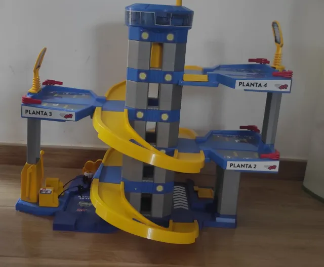 Detalles del productoParking de juguete de varias plantas con rampas y torre central.