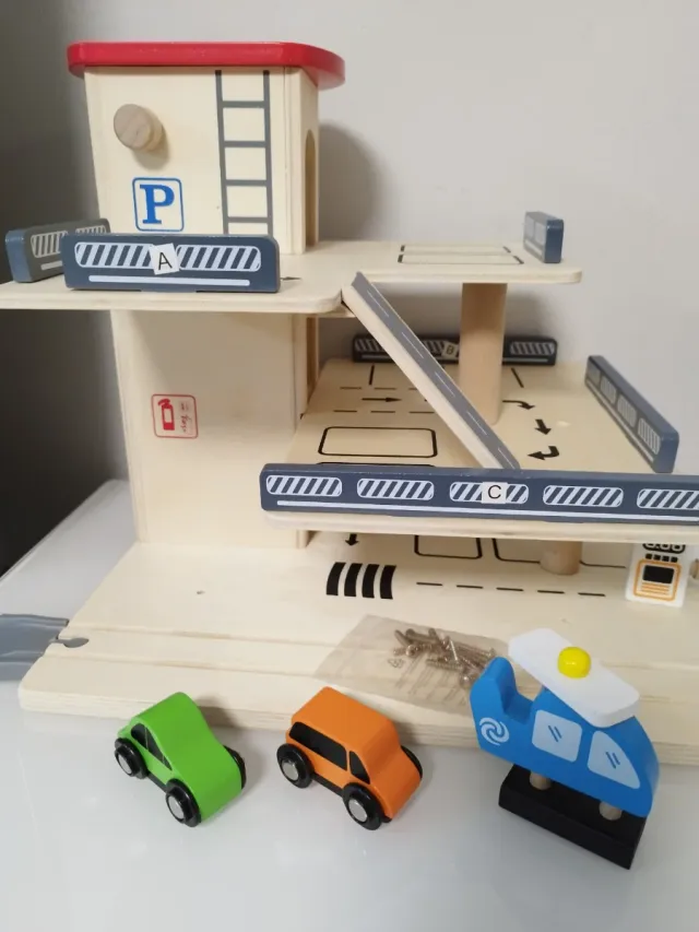 Parking de madera de la marca Kledio totalmente nuevo. - Diseño de garaje. - Incluye elementos 2 coches, un helicoptero