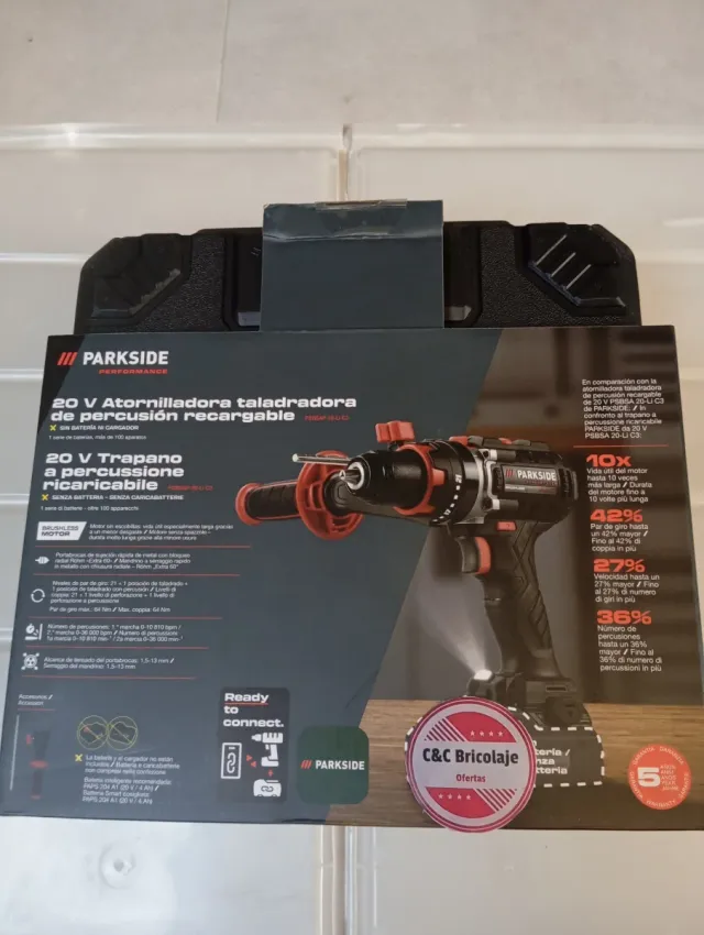 Detalles del productoTaladro atornillador percutor recargable Parkside Performance completo con batería y cargador incluidos en su maleta de transporte.