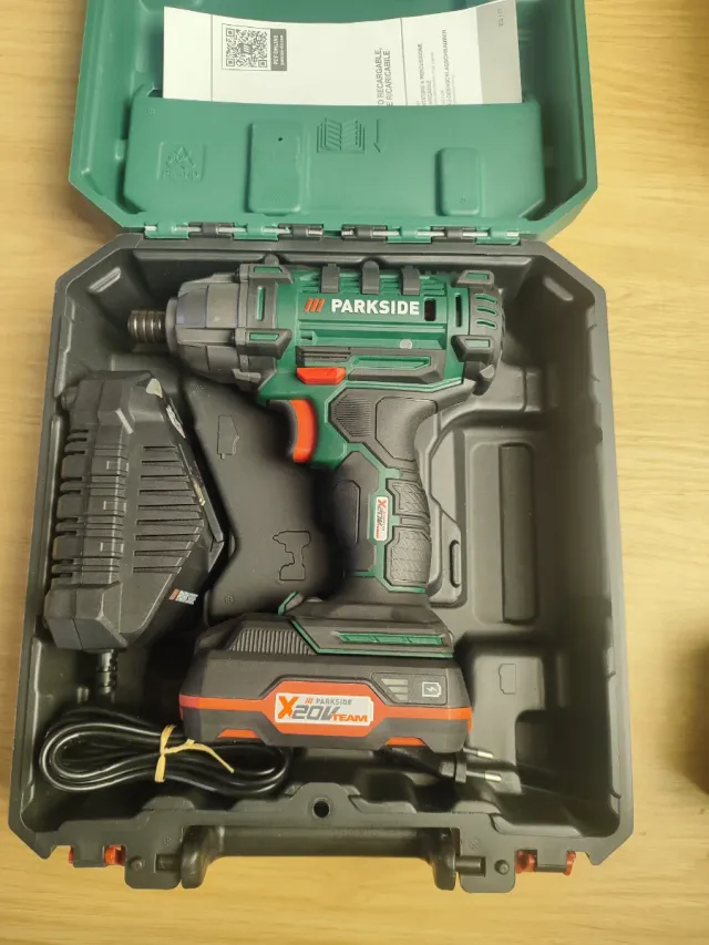 Taladro atornillador de impacto Parkside + cargador - Incluye maletín. - Cargador - batería x20V - Manual de instrucciones.