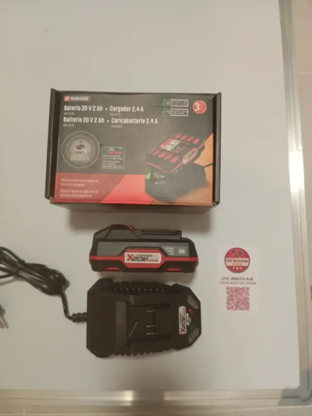 Detalles del productoKit de batería Parkside de 20V y 2Ah junto con su cargador rápido de 2.4A.