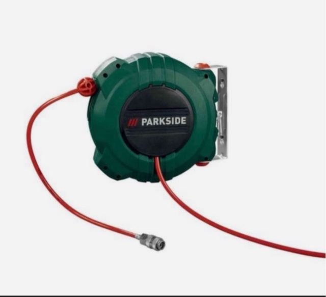 Manguera con tambor cómodo con recogida automática / Carcasa del tambor con giro de 180* y soporte de pared muy resistente de metal / El tambor se puede retirar del soporte de pared sin necesidad de herramientas / Manguera de are comprimido de 10 m, incluida pieza de conexión rápida (147)./ Manguera con conexión de compresor de 3 m con pieza de conexión (4*) / Fijación de la manguera extraida mediante el bloqueo de partes pequeñas / Se enrolla automáticamente al dar un tirón breve a la manguera/ Para montaje de pared o en suspensión con mosquetón integrado/ Incluye material para el mo