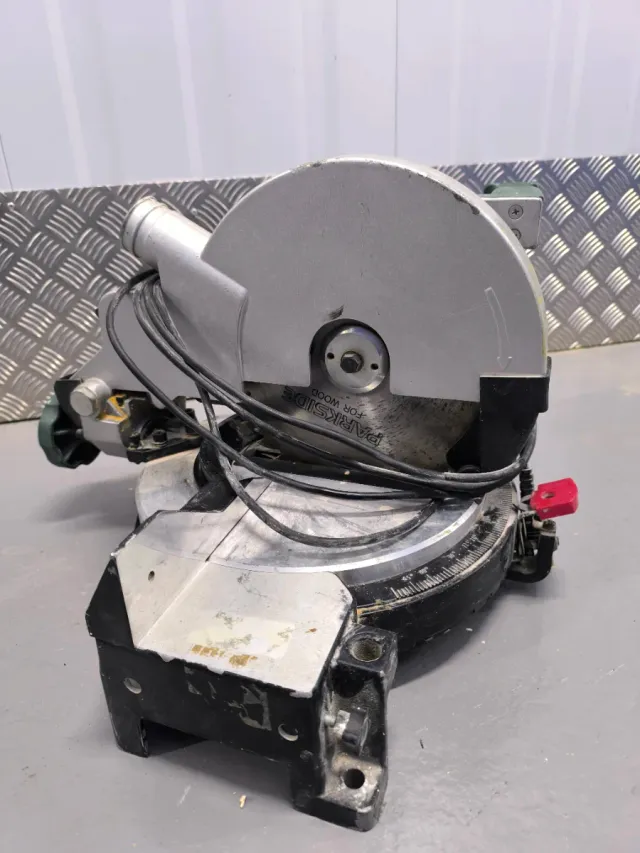 Sierra ingletadora Parkside PKGS 1450 para madera. Ideal para cortes precisos. - Incluye disco para madera. - Base estable para mayor seguridad.