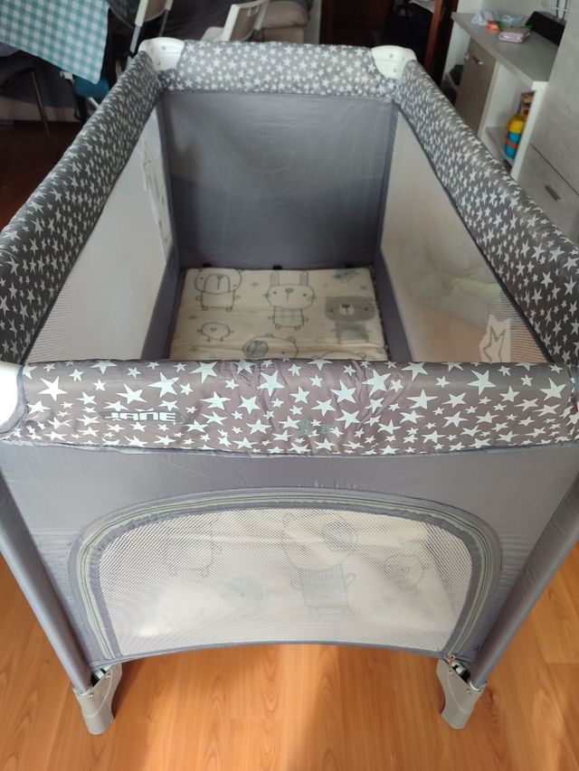 Detalles del productoParque y cuna de viaje de la marca Jane. Ideal para viajar o para casa de los abuelos. Diseño de estrellas con ositos de color gris. Fácil de montar y de transportar. Incluye bolsa de transporte.