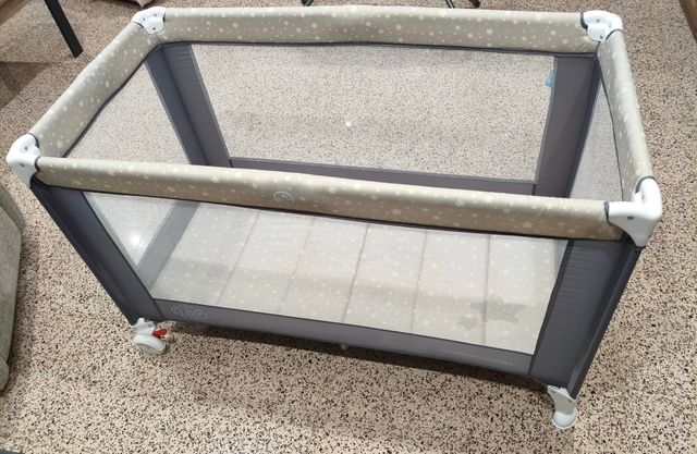 Parque cuna en color gris con estampado de estrellas. - Laterales de malla transpirable. - Acolchado en los bordes superiores. - Ruedas para facilitar el desplazamiento.