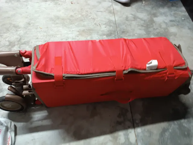 Detalles del productoParque cuna plegable de color rojo, ideal para viajes o para tener en casa.