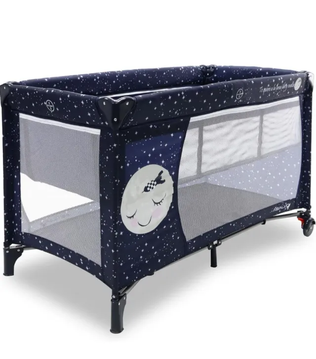Detalles del productoParque cuna de viaje con un bonito diseño de estrellas y luna.