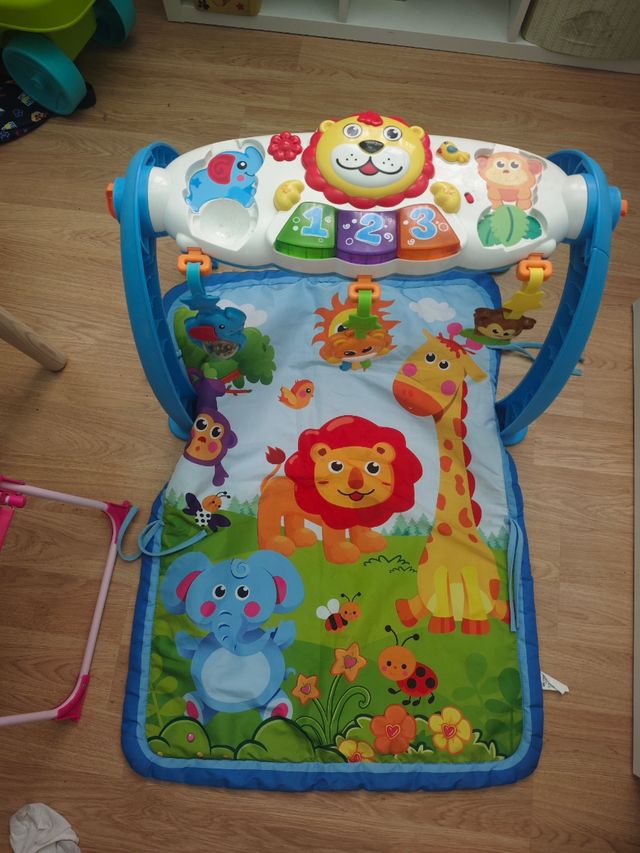 Detalles del productoDivertido parque de juegos para bebés con un gimnasio interactivo. Incluye varios juguetes colgantes y un tapete acolchado con dibujos de animales.
