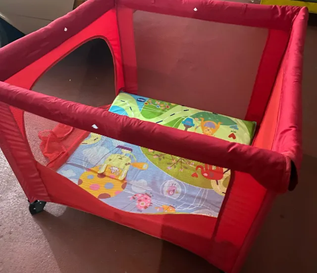 Detalles del productoParque infantil de juegos de la marca Chicco en color rojo. Incluye un colchón con dibujos.