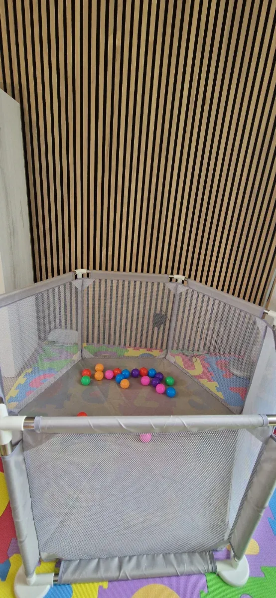 Parque infantil de tela gris. - Estructura de malla transpirable. - Fácil de montar y desmontar. - Incluye pelotas de plástico. - Puerta lateral con cremallera 127x127cm