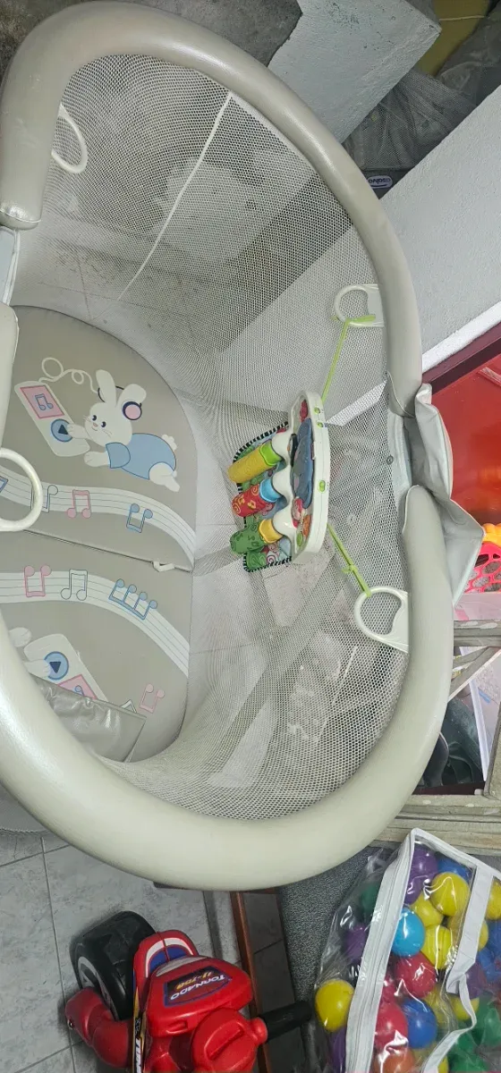Parque infantil para bebés en buen estado, con un divertido diseño de conejitos y notas musicales. Incluye un gimnasio de actividades.