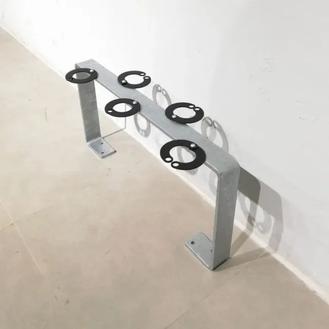 Pàrquing fet d'acer galvanitzat al forn amb capacitat per a 5 patinets de gran lleugeresa i resistència i abraçadores de subjecció revestides de plàstic.