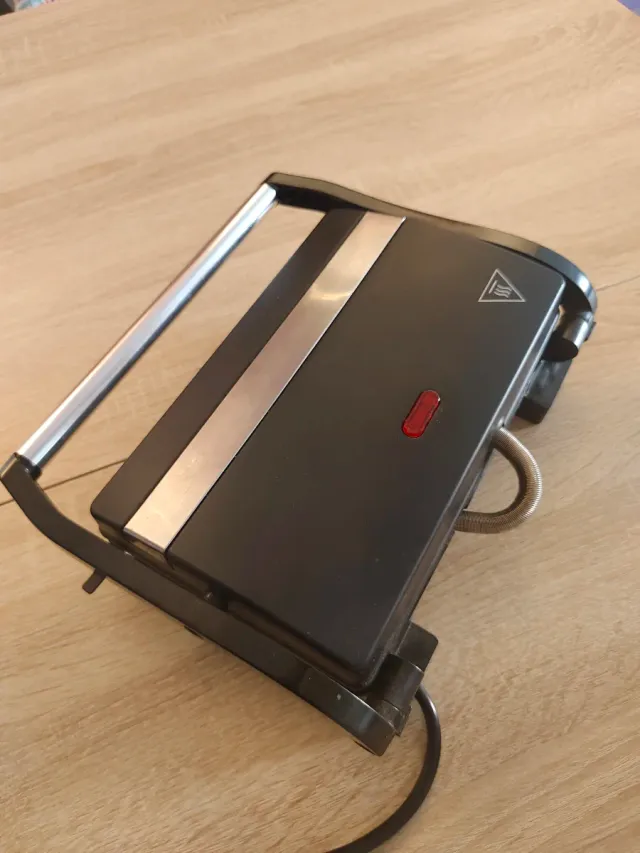 Parrilla eléctrica de color negro, con detalles plateados y un asa metálica. - Indicador luminoso rojo. - Diseño compacto.