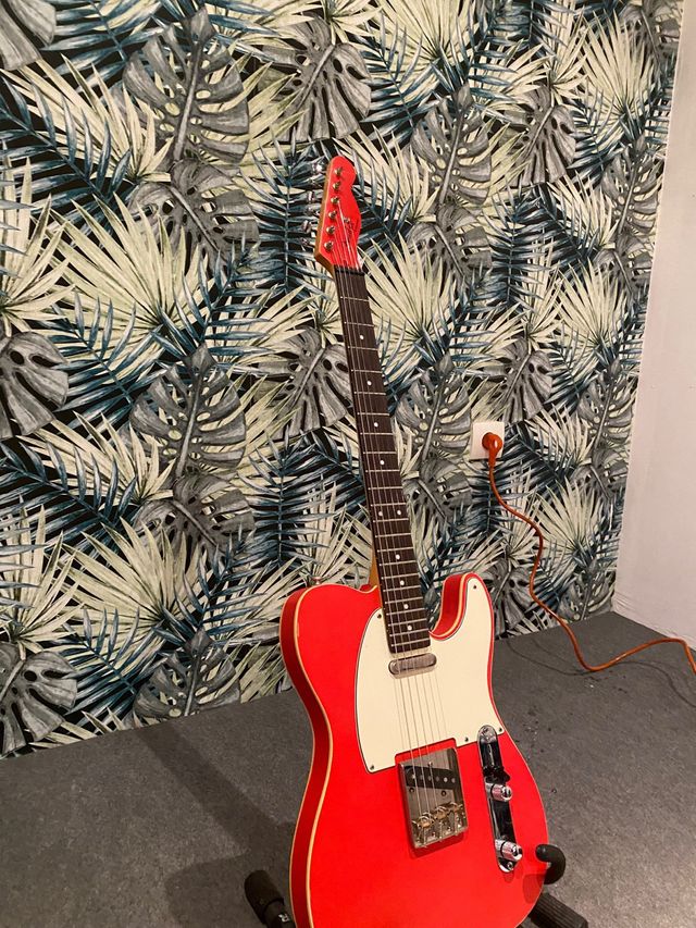 Detalles del productoTelecaster montada con piezas de calidad, lacada a nitro a poro abierto en Torino Red con doble binding crema, y matching headstock con la pala del mismo color.