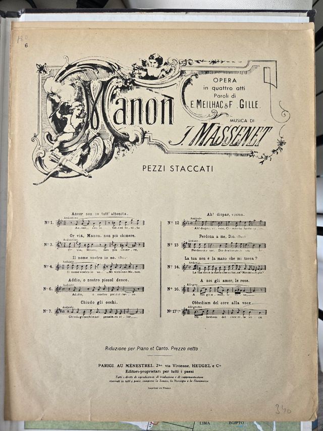 Partituras antiguas de la ópera Manon de Massenet. Son piezas musicales para piano. Las partituras están en buen estado de conservación.