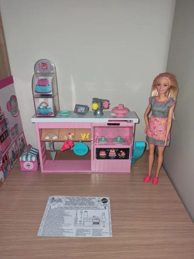 Set de pastelería de Barbie para crear deliciosos postres. - Incluye una muñeca Barbie con delantal. - Estación de pastelería con accesorios. - Exhibidor para pasteles.