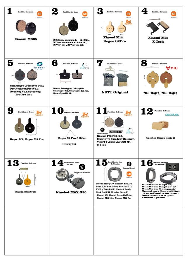 Pastillas Freno Xiaomi, SmartGyro, Kugoo,NIU,Ninebot,Cecotec,Dualtron... Precios_ 1,2,3,4,5,6,7,8,9,10,11,12,13-6€ 14-10€ 15,16-8€