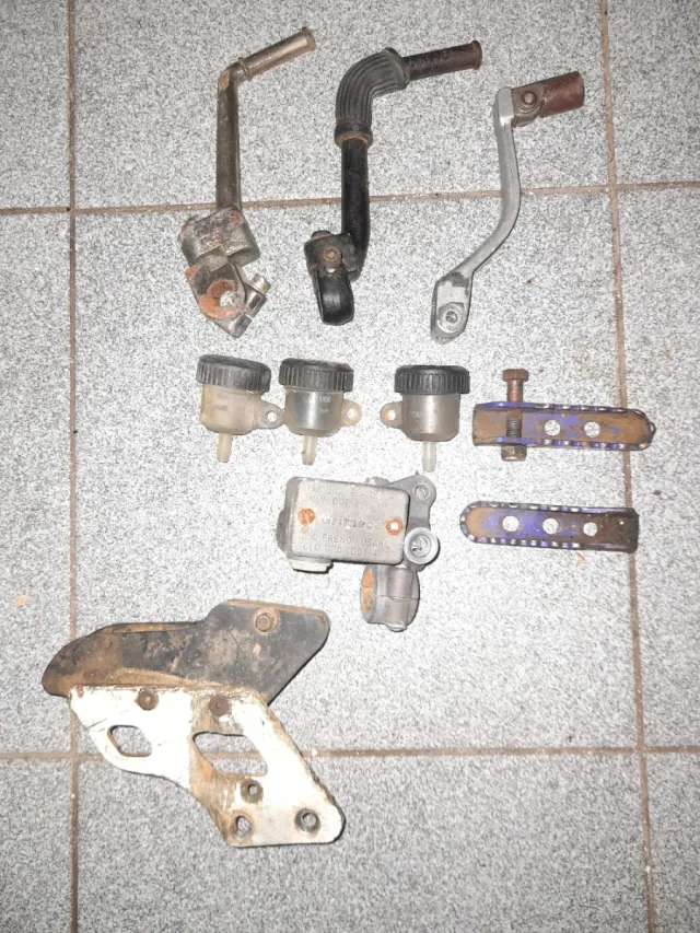 Detalles del productoConjunto de piezas para moto Derbi Senda, incluyendo patas de arranque y cambio, botes líquido de frenos, estriberas, patin de cadena, bomba de freno grimeca.