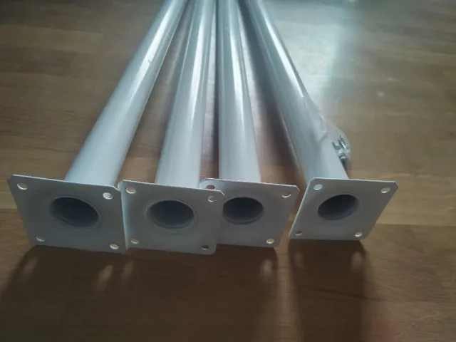 Detalles del productoConjunto de cuatro patas blancas para muebles o estructuras. Miden 80 cm de largo y tienen una base cuadrada con orificios para su fijación.