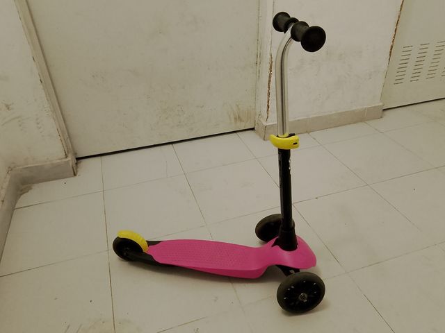 Detalles del productoPatín de tres ruedas con plataforma en color rosa y detalles en amarillo.