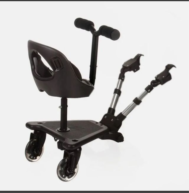 Accesorio para carrito de bebé que permite que un niño mayor viaje de pie o sentado. - Asiento negro. - Plataforma con ruedas. - Manillar ajustable.