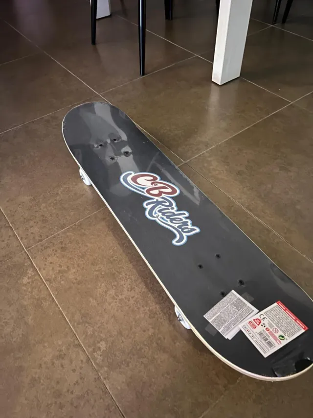 Patín de skate de la marca CB Riders. - Tabla negra con diseño. - Ruedas blancas.