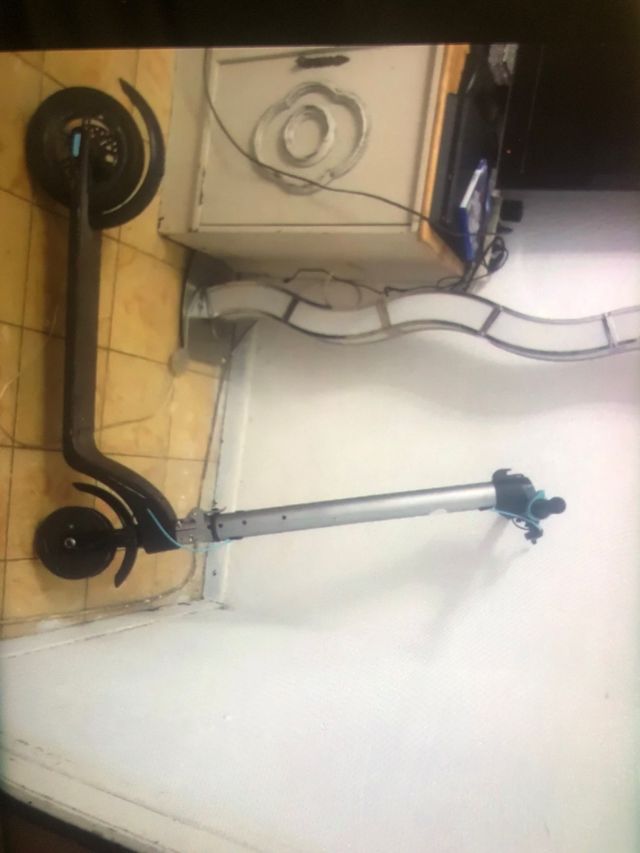 Patín eléctrico de color negro y plateado,bongo sin rueda delantera y con cargador - Manillar ajustable. - Rueda delantera y trasera. - Freno trasero.