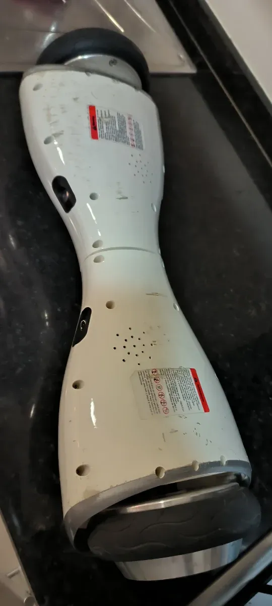 Este patín eléctrico blanco es un medio de transporte divertido y práctico. - Diseño moderno y elegante. - Ruedas resistentes para un desplazamiento suave.