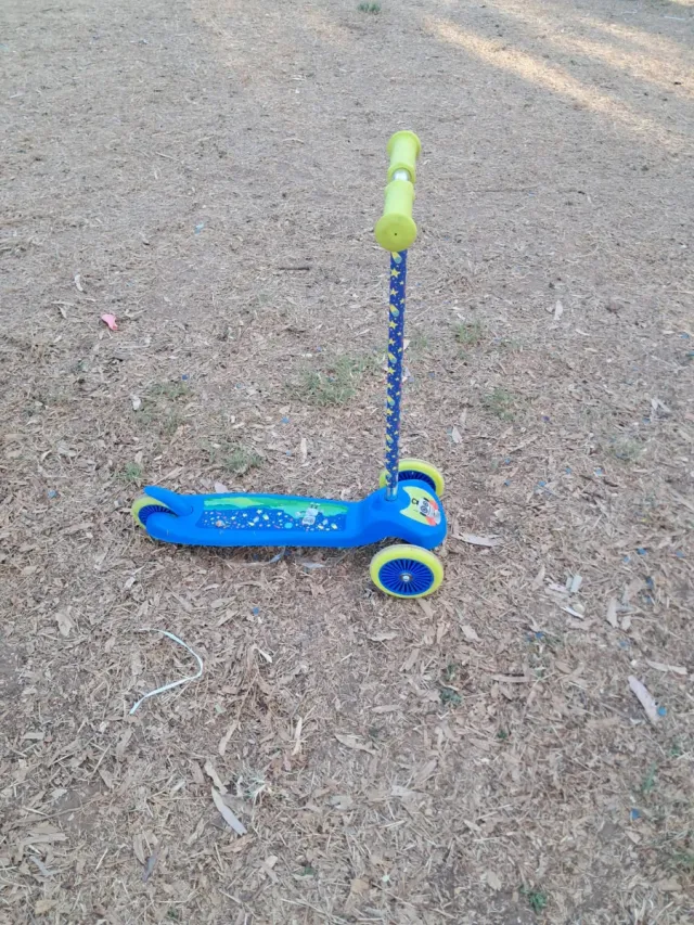 Detalles del productoPatín de tres ruedas para niños, de color azul con detalles en verde.