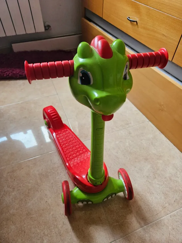 Detalles del productoDivertido patín de tres ruedas con un simpático diseño de dragón, perfecto para los más pequeños.