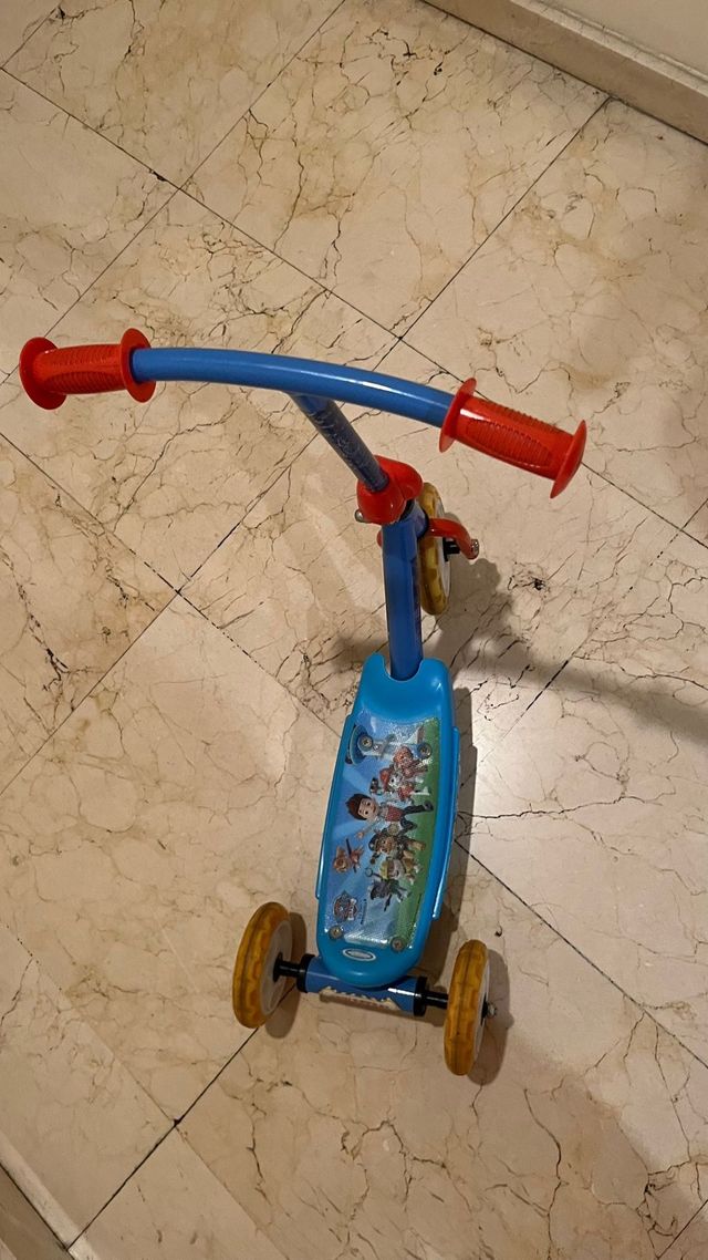 Detalles del productoPatín de tres ruedas con diseño de Paw Patrol para niños. El manillar es azul con puños rojos.