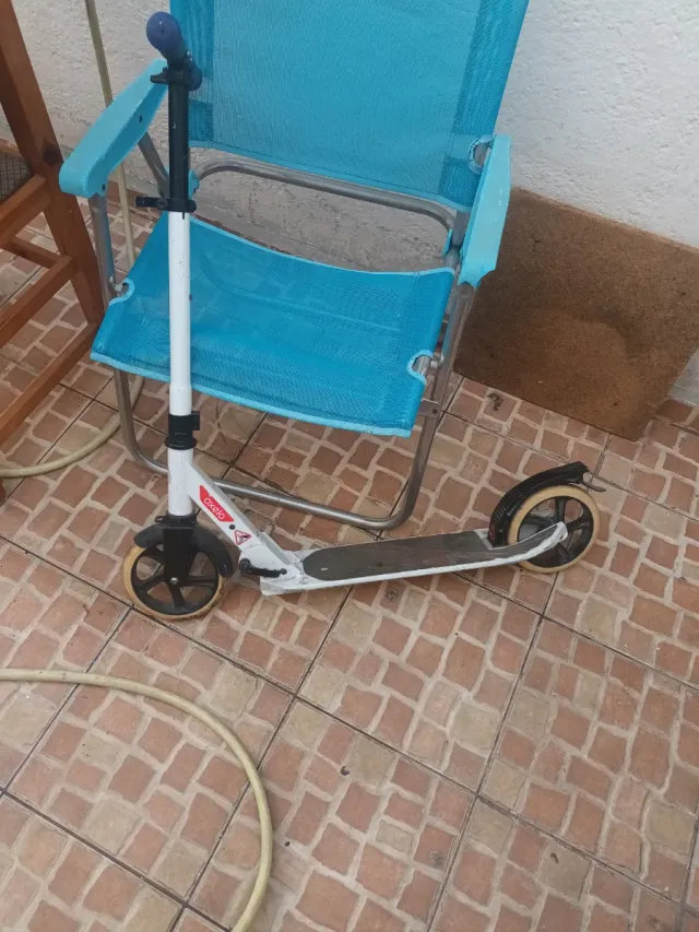 Patín de la marca Oxelo en color blanco, diseñado para niños. Es ligero y fácil de manejar. - Plataforma antideslizante. - Ruedas de goma. - Manillar ajustable.