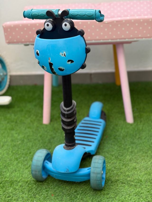 Este patinete infantil tiene un divertido diseño de mariquita. - Color azul. - Tres ruedas para mayor estabilidad. - Manillar ajustable.