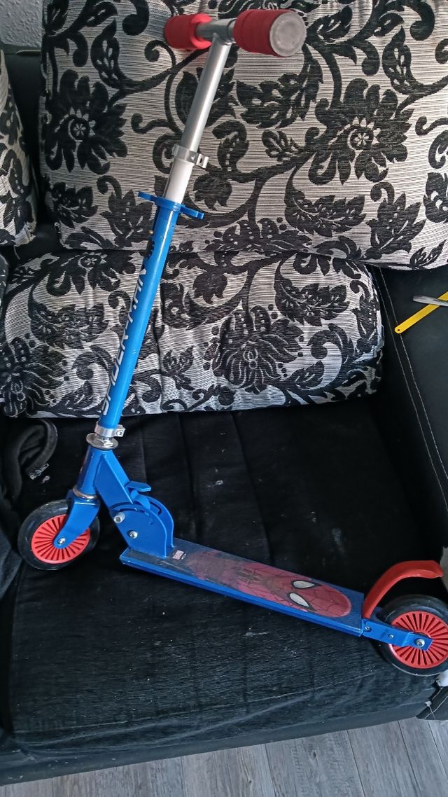 Patín infantil con diseño de Spiderman. - Color azul. - Ruedas rojas. - Manillar ajustable.