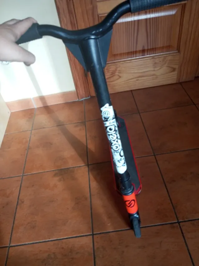 Patín en colores rojo y negro. Presenta un pequeño detalle de rajadura. - Diseño llamativo. - Manillar negro.