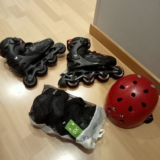 Se venden patines de niño talla 35/38, se adaptan según el número de pie,casco talla 55/58 cm y protectores talla 6/10 años.