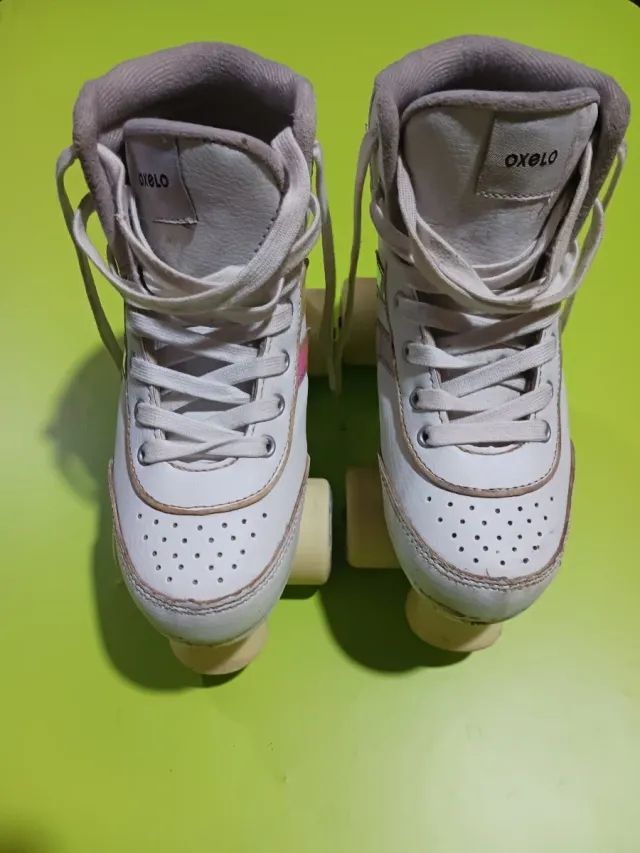 Se venden patines Oxelo en color blanco, talla 35. Ideales para iniciarse en el patinaje. - Diseño tipo bota. - Cierre con cordones. - Ruedas de color claro.