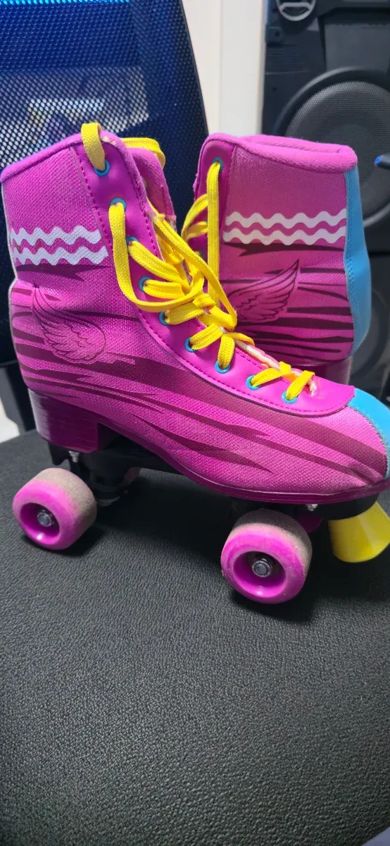 Patines de la serie Soy Luna en color rosa. - Diseño con rayas y detalles de alas. - Cordones amarillos. - Ruedas rosas.