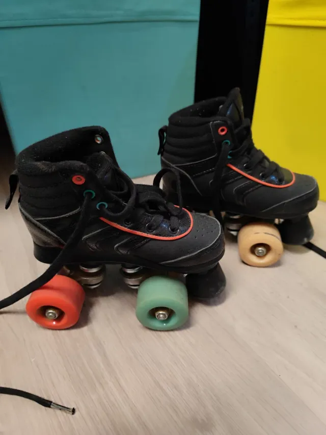 Patines de cuatro ruedas en color negro con detalles en naranja y turquesa. - Diseño de bota alta. - Cordones negros. - Ruedas de colores: dos naranjas y dos verdes.