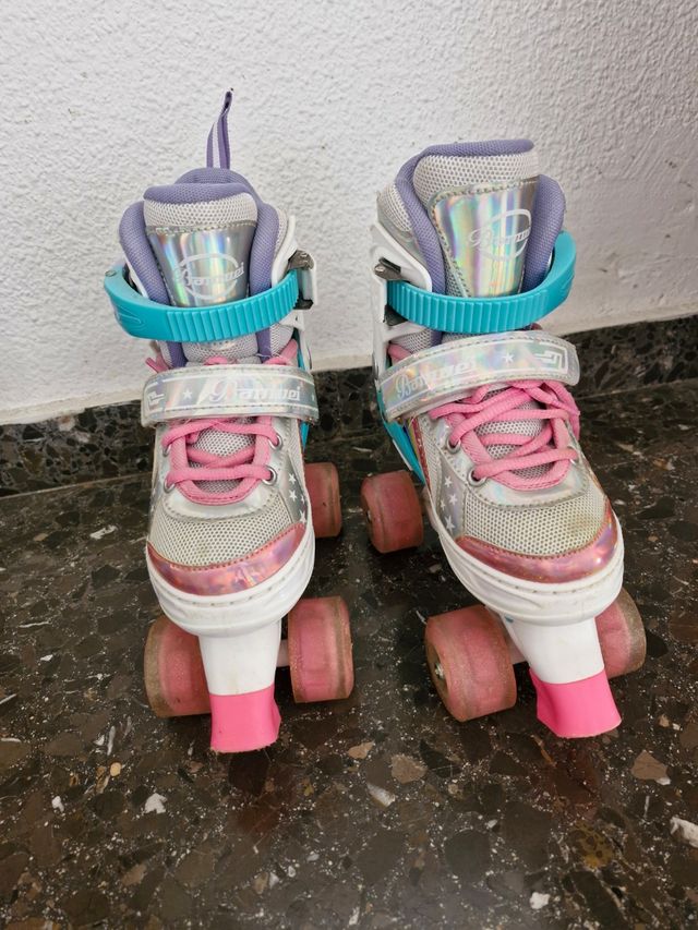 Detalles del productoPatines de cuatro ruedas para niña en talla S. Diseñados con un estilo divertido y llamativo.