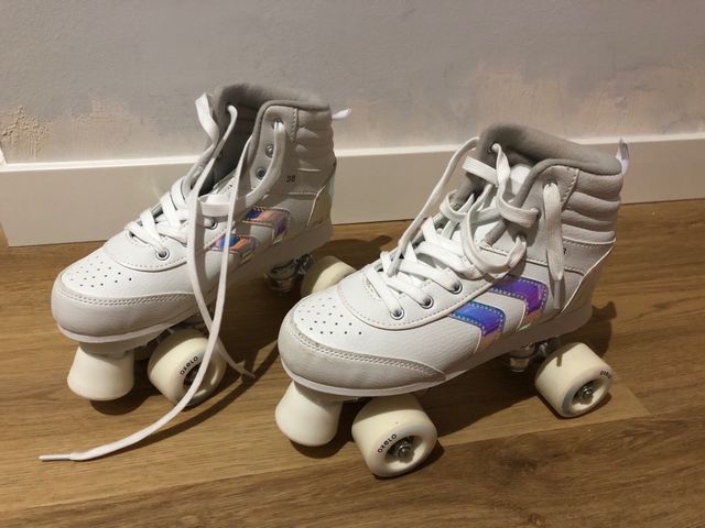 Detalles del productoSe venden patines de cuatro ruedas en color blanco, talla 38. Incluyen protecciones y una bolsa para transportarlos.