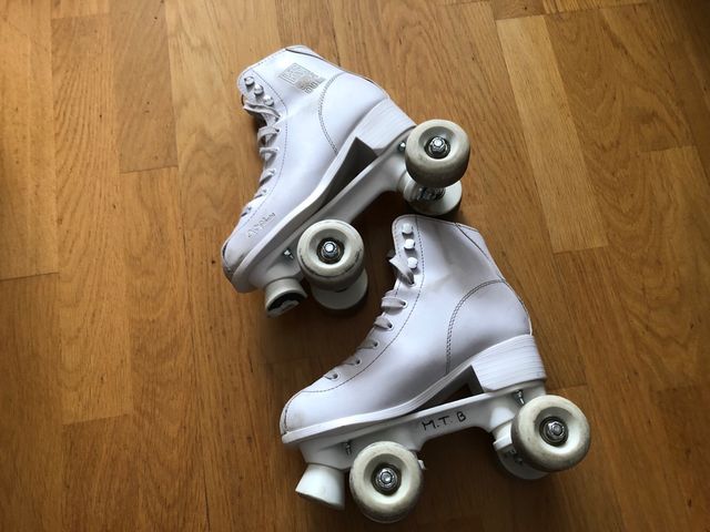 Vendo patines artísticos de 4 ruedas en piel blancos, en buen estado, un freno desgastado , se puede sustituir.