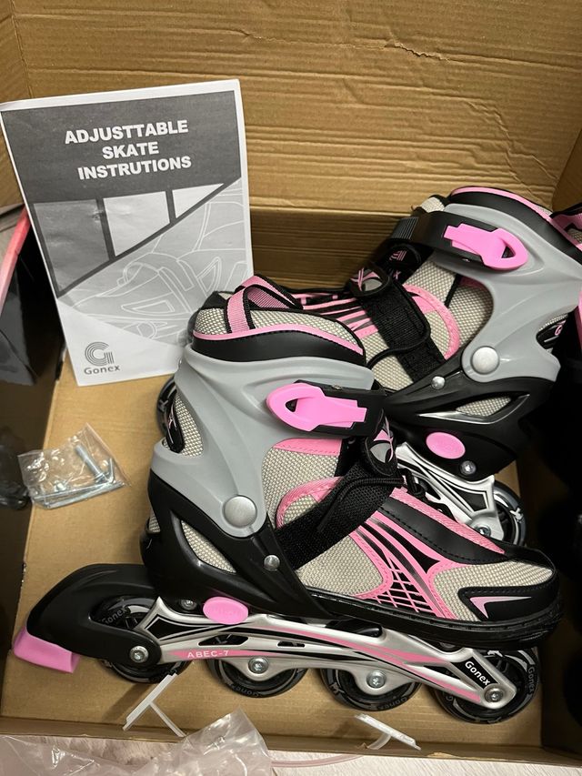 Detalles del productoSet de patines en línea ajustables Gonex, ideales para niños y principiantes. El diseño combina colores rosa, negro y gris.