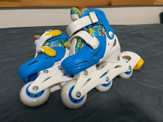 Patines infantiles con diseño divertido y ajustable. - Talla: 27-30 - Cierre con velcro y hebilla. - Ruedas de alta resistencia. - Diseño colorido.