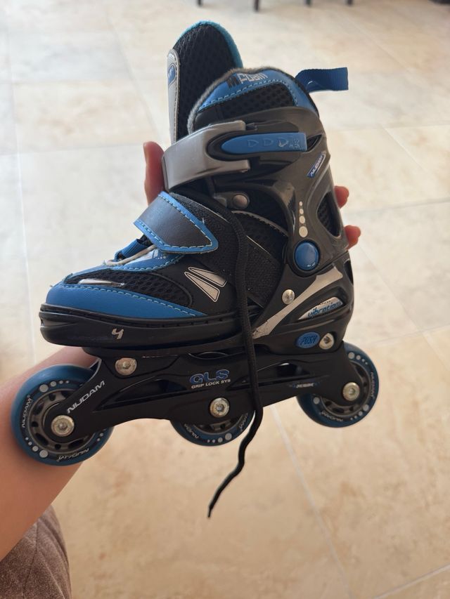 Patines infantiles en color azul y negro, con ajuste de talla. - Talla ajustable de 27 a 30. - Cierre de velcro y hebilla. - Ruedas con sistema Grip Lock Sys.