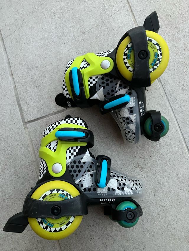 Detalles del productoPatines infantiles con un diseño llamativo a cuadros y detalles en verde lima y azul. Son ajustables para adaptarse al crecimiento del pie.