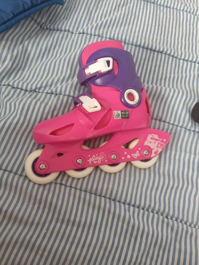 Patines en línea para niña, ajustables en talla. - Color rosa y morado. - Talla 30-32 (19-20 cm). - Diseño con estrellas y mariposas.